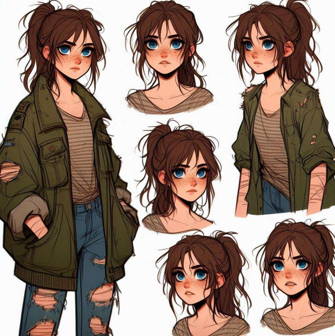 Frequently worn jewellery/accessories: Worn out army jacket, a necklace with a key on it. The key is to her journal. In her jacket, she will always have: some type of phone/communication, snacks, a book (usually goosebumps), her journal, a pen, markers, whatever cash she's managed to steal, and a switchbladeHEALTH